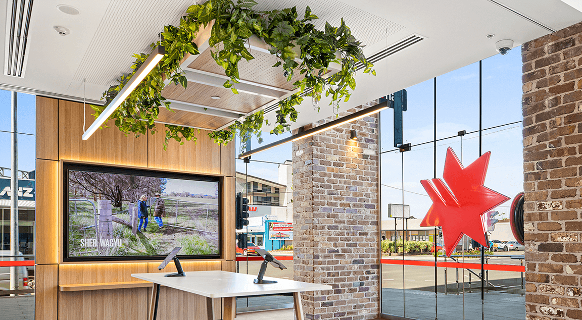 An open-plan design that's visible to passers-by meant NAB's newest branch in Sydney's Martin Place needed revitalising with greenery to soften the corporate feel. Evergreen's canopy of artificial vines & pot-plants create a welcoming environment for clients and staff.