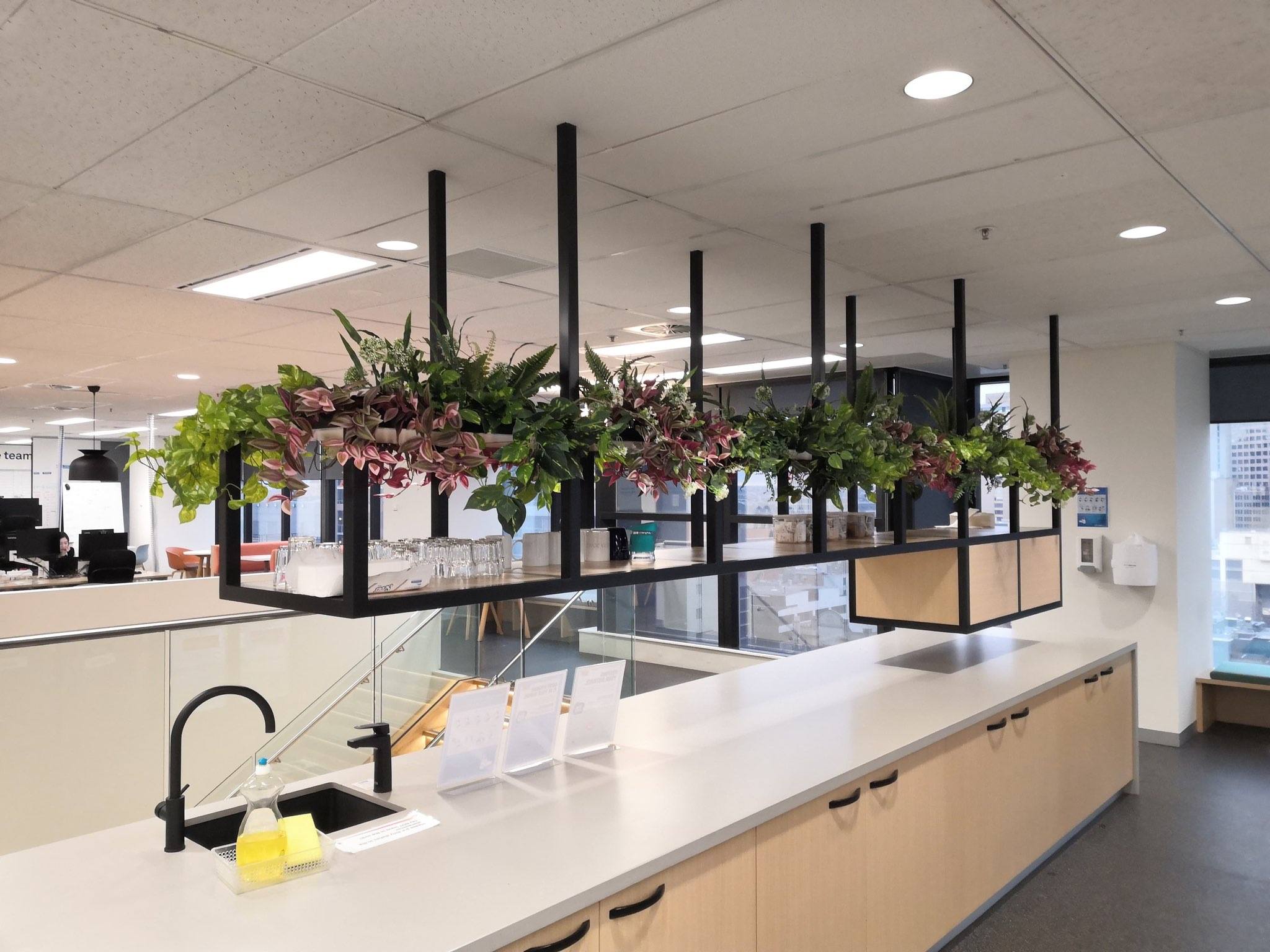 To brighten the atmosphere and bring some much needed vibrancy into the workplace, we created bespoke luscious hanging greenery throughout the office space.